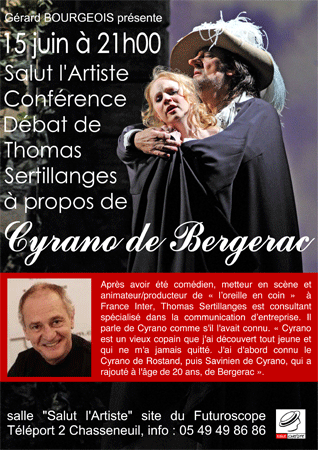 En fait, c'est plus que cela car en comparant le personnage réel et le héros de Rostand il nous fait découvrir, non une chronologie livresque d'érudit qu'il est, mais l'enchevêtrement de leurs traits de caractère, et non seulement ceux du vrai Savinien et du personnage de théâtre, mais aussi ceux d'Edmond Rostand lui-même. Avec son enthousiasme communicatif, Thomas Sertillanges trouve un éclairage nouveau pour voir sous le le personnage de Cyrano que beaucoup connaissent bien, la persistance à travers le temps de qualités humaines profondes… et universelles. Que nous n'avons à notre époque un Cyrano pour nous tirer vers le haut… Merci monsieur Sertillanges. » * *