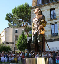 Une nouvelle statue de Cyrano a été inaugurée début juillet à Bergerac, place Pélissière, dans la vieille ville. "J'ai d'abord choisi un modèle pour le corps, Thierry Dufourneaud, qui habite Paris", raconte l'artiste, "le visage est né ensuite de mon imagination". Réalisée en bronze polychrome, l'œuvre de Mauro Corda a coûté 90 000 euros. Avec le projet d'ouvrir une "Maison de Cyrano" la ville semble vouloir ainsi répondre, au moins partiellement, à l'attente des touristes qui, fort logiquement, même au détriment de la vérité historique, entendent bien retrouver à Bergerac la mémoire de Cyrano. |