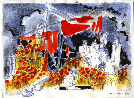 Là, il laisse aller son fusain sur la feuille blanche, attentif à saisir, comme dans un instantané, le regard du comédien, le geste de la comédienne, le reflet du mot qui surgit, vole, rebondit sur le décor, et s'en va au-dessus des cintres, aussitôt suivi par mille autres...