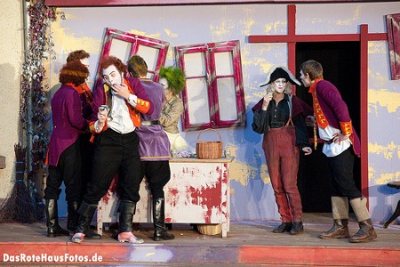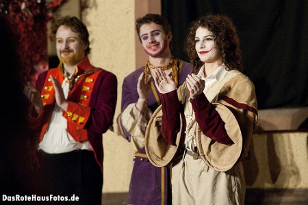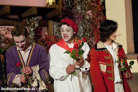 Trois mois de répétitions et vers la fin de mai 2010 la troupe théâtrale de Theaterteam "Spieltrieb" est déjà prête à rendre au su du public sa vision moderne, enthousiasmante et enthousiasmée de « Cyrano de Bergerac ». Une performance spectaculaire, qui avec ses comédiens de 13 à 55 ans, remonte sans hésitation les aiguilles du temps et raconte avec beaucoup d’amitié, de chaleur et d’humour l’histoire de Cyrano. Deux interprètes se partagent ce rôle pas facile : Simon Joshua Merz; qui joue le jeune Cyrano et Roger Tietz, qui joue le vieux Cyrano. Pour Simon Joshua Merz c’est un spectacle de diplôme, examen qu’il réussit avec panache, pendant que – conception originale des meteurs en scène - “le vieux Cyrano†observe à travers son jeu sa propre vie et la commente avec les autres personnages de la pièce, sans manquer d’impliquer le public à ses raissonnements.