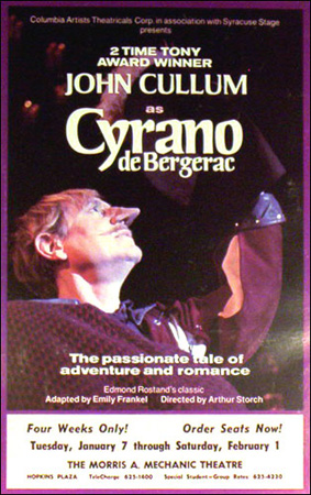 "John Cullum's Cyrano bestrides each scene like a Colossus, revealing the full range of emotions raging inside this epic figure. Wit, disdain at the cowardice of his enemies, self-consciousness about his wretched quirk of nature, his ridiculous nose which constantly rocks his self-esteem -- all these facets Cullum reveals with unerring skill. Above all, however, it is his unswerving, heartfelt and lifelong passion for the lovely Roxane that constantly captures us and melts our sensibilities. We really feel with this man who thinks love is closed to him because of his imagined ugliness." William West, Syracuse Post-Standard, 1/7/84