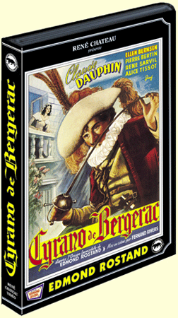 D'après les critiques retrouvées - voir à Claude Dauphin dans le chapitre "Sur scènes et sur écran ", ce ne fut pas une réussite ! Mais pour qui aime, ou simplement s'intéresse à Cyrano, c'est naturellement à voir. Et Philippe Donadille nous y encourage : Tout amateur d’un genre cinématographique a son panthéon des œuvre « oubliées et introuvables ». Autrement dit, les films qu’il rêve de voir un jour, mais qu’il est bien difficile de dénicher. Pour ma part, dans la catégorie de cape et d’épée j’ai en tête « Le brigand Gentilhomme » (1942) ou encore « La Tour de Nesles » (1951) d’Emile Couzinet, « Le Chevalier mystérieux » (1948) de Riccardo Freda , « Le Tournoi » (1929) de Jean Renoir , « Jérôme Perreau » (1936) d’Abel Gance. Il y en a d’autres. Ne les ayant pas vus, je ne peux affirmer qu’ils appartiennent au genre ; je me base juste sur quelques clichés de plateau, quelques articles et des affiches, toutes alléchantes. Et puis il y avait ce Cyrano de Fernand Rivers. Certains diront que si ces films ne sont pas parvenus jusqu’à nous, c’est qu’ils ne le méritaient pas vraiment…Oui et non. Il s’agit parfois d’obscurs problèmes de droits, de copies inexistantes, de volontés d’artistes d’enterrer telle ou telle production. Mais certains veillent, René Château nous exhume ce Cyrano de Bergerac. Bien que recherché depuis longtemps, je suis un peu perplexe au moment où je glisse le DVD dans mon lecteur. Comment juger un film dont j’ai lu déjà moult fois (critiques d’époques), qu’il était affligeant, voire grotesque, ou tout simplement nul. Parodiant un des vers de Rostand un critique avait écrit « …Monsieur de Bergerac est mort assassiné…par Fernand Rivers ». Mais je garde en mémoire les splendides affiches dessinées pour la sortie du film, et je reprends espoir : tâchons de nous faire nous-même une opinion. La projection commence, si le film est effectivement nul, j’en étais averti, s’il est juste regardable ce sera déjà une bonne surprise. Quand on s’attend à un spectacle de qualité faible, on ne peut être qu’agréablement surpris, n’est-ce pas ? Ce fut mon cas. Certes les défauts sont légions : mise en scène inexistante (théâtre filmé), coupures de texte pas toujours bien choisies (mais les vers qui restent sont bien ceux de Rostand, il n’y a pas eu de ré-écriture comme pour la version Rappeneau), acteurs jouant à l’ancienne (Roxane notamment),…La liste serait encore longue. Mais puisqu’il s’agit ici de dire que le film n’est finalement pas inintéressant je préfère m’attarder sur ce qui m’a plu. Déjà il y a la pièce de Rostand qui reste un texte fabuleux, difficile donc de taxer d’affligeant un film dont le scénario et les dialogues sont si bons. Ensuite il y a l’interprète principal, qui sort fort bien son épingle du jeux. Le Cyrano campé par Claude Dauphin est tout à fait crédible, visuellement assez réussi (costume, attitudes, postures), interprété de manière assez juste, selon moi. Quelques atmosphères sont bien rendues : la scène du balcon, le cinquième acte notamment, du fait de décors joliment construits, et d’ambiances bien recréées. Une trouvaille charmante m’a amusé : Quand Cyrano imagine les façons de se rendre sur la lune, chaque méthode est illustrée par des séquences de dessins animés. |