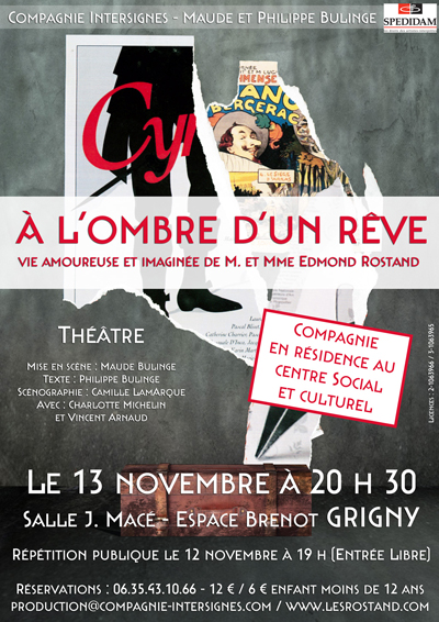 Toutes celles et ceux qui, un jour, ont cherché des informations sur Edmond Rostand, ont forcément atterri sur le site qui porte en sous-titre l'un des plus beaux vers du poète "C'est la nuit qu'il faut croire à la lumière". L'une de dernières créations de la compagnie Intersignes que Maud et Philppe Bulinge ont créée évoque la vie amoureuse Edmond et de Rosemonde. Vendredi 13 novembre à 20h30 Salle Jean Macé - Espace Brenot 5 Rue Waldeck Rousseau 69520 Grigny Répétition ouverte au public le jeudi 12 novembre à 19h (Entrée libre) RESERVATIONS 06 35 43 10 66 PRIX : 12 euros - enfant de moins de 12 ans, 6 euros  DISTRIBUTION Mise en scène : Maude Bulinge Texte : Philippe Bulinge Scénographie : Camille Lamrque Avec Charlotte Michelin et Vincent Arnaud |