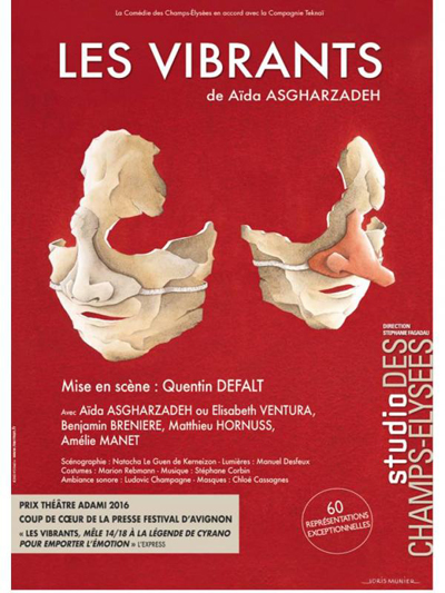 1914. Eugène, aussi beau qu’insolent, part pour le front comme engagé volontaire. Surpris par à un éclat d’obus à Verdun, il devient l’une de ces nombreuses gueules cassées. Une pièce de Aïda ASGHARZDEH Mise en scène par Quentin DEFALT jusqu'au 30 décembre 2017  Note d'intention « À l’origine de cette pièce, il y a l’exposition « 1917 », au Centre Pompidou de Metz dont la scénographie en spirale menait le visiteur, sans qu’il s’en rende compte, de la représentation picturale de la déconstruction de l’homme à sa matérialisation la plus charnelle : des moulages de visages de gueules cassées. Ces visages estropiés cristallisent avec une intensité terrible la complexité de la question identitaire qui, je crois, hante chaque artiste, du moins habite chacun de mes textes. La question de l’apparence, de celle qu’on renvoie, de celle qu’on choisit, qu’on subit ou qu’on nous impose. Peut-on être vraiment qui on veut ? Peut-on être vraiment libre ? Eugène perd le masque qu’il s’est construit pour affronter la société, à savoir son visage. Après de multiples chirurgies qui transforment davantage son apparence, il doit s’habituer à un nouveau masque qu’on lui impose en portant une prothèse nasale. Et à un troisième niveau, il découvre un nouveau « lui », dans un espace atemporel et libre avec le masque de scène. En écrivant Les Vibrants, la rencontre entre Eugène et Sarah Bernhardt, la résonnance entre cet inconnu et les mythiques personnages de Richard III et de Cyrano, j’ai, pour la première fois, vu mon métier comme une lutte contre le temps. Un besoin d’exister et de revendiquer cette existence, un besoin de « faire croire » aux autres, pour qu’ensemble nous nous évadions non pas de nos petits problèmes quotidiens et personnels, mais bien au contraire, de ce qui nous effraie communément, de ce qui nous relie tous et n’épargnera aucun d’entre nous. Pour la première fois, j’ai réalisé que j’avais peur de la mort et que c’était ma façon de faire avec et d’accepter cette chose si éphémère et pourtant si plaisante qu’est la vie ».