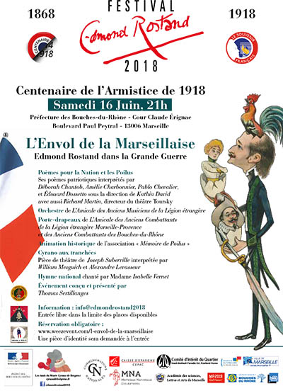Un événement exceptionnel En 1914, malgré son vœu le plus cher, Edmond Rostand ne pourra être mobilisé à cause de son âge et de sa santé. Affligé, se sentant presque humilié de ne pouvoir partager le destin collectif des jeunes français, il mettra sa notoriété au service de la France en soutenant son pays notamment au travers de ses poèmes réunis sous le titre « Le Vol de la Marseillaise », visitera les Poilus sur le front, soutiendra le moral des troupes, multipliera les actions caritatives… Le spectacle raconte la Grande Guerre vécue par Edmond Rostand et illustrée par ses poèmes dits par les comédiens Déborah Chantob, Amélie Charbonnier, Pablo Chevalier et Edouard Dossetto. Musiques militaires et d’époque interprétées par « L’Amicale des Anciens de la Musique de la Légion étrangère », Ce sera aussi l’occasion de découvrir une courte pièce jouée pour la première fois en 1918, « Cyrano aux tranchées » de Joseph Suberville, avec William Mesguich et Alexandre Levasseur en costume. Conversation détonante en alexandrins entre un Poilu et Cyrano, regards croisés sur cette guerre. "Le Vol de la Marseillaise" sera dit par Richard Martin, directeur du Théâtre Toursky.      La soirée se terminera par le chant de La Marseillaise interprétée par la cantatrice Isabelle Vernet. Dans la cour d’honneur de la préfecture, l’association « Mémoire de Poilus » installera un hôpital de campagne avec soldats en uniforme. Un spectacle conçu et présenté par Thomas Sertillanges. Labels du Souvenir français et de la Mission 14-18