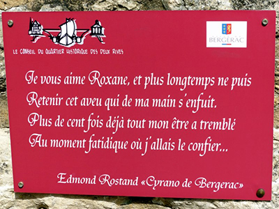 Le Conseil du quartier historique des Deux Rives a eu l'idée de poser une plaque à côté de la statue de Cyrano place Pélissière comprenant quatre vers signés Edmond Rostand. Quand on célèbre notre cher empanaché, il faut soulever son chapeau... Dommage que la citation soit fausse ! Les quatre vers en question ont été écrits par un contributeur de notre site qui s'est amusé à compléter, en hommage à notre poète, la lettre que Cyrano écrit à Roxane à la scène 4 du 2e acte, lettre dont on n'entend dans la pièce que quelques mots. Reste à espérer que le Comité de quartier puisse rétablir la vérité littéraire et changer cette citation pour rendre à Edmond ce qui appartient à Rostand.  Â