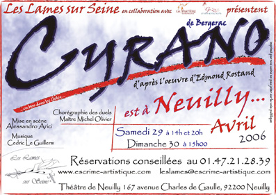 Après trois années de représentation au château de Gizeux (Indre et Loire), Cyrano retrouve les planches avec cette adaptation contée, fidèle au texte d'Edmond Rostand. « Le metteur en scène est nourri par l'aspect création du personnage et son intégration dans le conte ; le public comme les acteurs vivent en direct l'enchaînement de l'histoire... » Distribution Cyrano de Bergerac - Vincent Clergironnet Roxane/Bellerose - Charlotte Maingard Montfleury/Valvert/Ragueneau - Guillaume Leray Baron Christian de Neuvilette - Arnaud Tsamère La duègne - Christine Sabatier Baillet Henry Le Bret - Maître Michel Olivier Lignière, Monseigneur de Guiche - Alessandro Arici Les Mousquetaires des Lames sur Seine Et les infatigables bénévoles... |