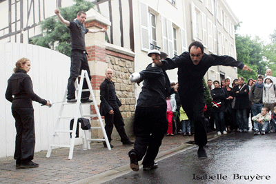 Cyrano, notre modèle ultime ! Dans l’inconscient collectif francophone, Cyrano de Bergerac est l’un des derniers romantiques et le plus délicat des amoureux. Une figure si vivante qu’elle se confond avec un vrai héros de chair et de sang. Dans une époque qui, comme la nôtre, a perdu ses repères, Cyrano apparaît comme un modèle, un idéal, une image d’Epinal, mais une image vivante : car avant tout, Cyrano est un révolté. Personne, pas même le roi, ne lui fera mettre un genou à terre. Il est de la race de ceux qui préfèrent la mort plutôt que se trahir eux-mêmes. Ce personnage haut en couleurs de Edmond Rostand a inspiré moult spectacles, de la scène au 7ème art. J’ai donc cherché une autre voie pour faire partager au public l’extraordinaire énergie de ce texte, la modernité de son propos et sa poésie. La rue s’est imposée immédiatement, et donc la confrontation au monde extérieur, loin de la scène traditionnelle. L’expérience réalisée dans deux villes suisses (Neuchâtel et La Chaux-de-Fonds) ont prouvé l’intérêt du public. Séduits, amusés, émus, parfois même une larme à l’œil, les spectateurs se sont pressés autour des scènes jouées à même le macadam. Les personnages de la pièce s’expriment en alexandrins, qui se mêlent à la prose et à l’argot. Ainsi, la perfection un peu rigide du texte original est-il assoupli au profit de la psychologie des héros, du rêve qu’il essaiment dans l’imaginaire des spectateurs. Vivre avec lui ! Le théâtre pour tous Jouer Cyrano dans la rue, c’est offrir un classique et sa force de suggestion aux amateurs éclairés et aux simples quidams qui jamais ne franchissent le seuil d’un théâtre. Dans la rue, l’âge et la condition sociale des uns et des autres n’ont plus d’importance : on entoure Cyrano de 4 à 80 ans ! Résistance Tel est bien le mot d’ordre et l’héritage de Cyrano ! Dans sa bouche, mais aussi dans celle de ses compères et de Roxane, la belle aimée sans espoir, la puissance des mots fascine le public qui se déplace sur une cinquantaine de mètres, entourant les personnages et le conteur, chargé de résumer les épisodes de la pièce. Ils sont comme nous Vêtus comme nous ou presque, avec des vêtements de tous les jours, transformés, retournés ou détournés, les personnages qui accompagnent Cyrano sont proches du public. D’autant plus que par deux fois, les spectateurs sont invités à participer à une scène. |