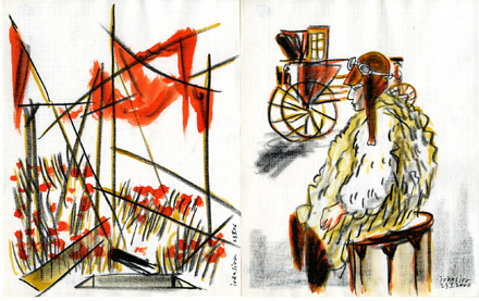 Là, il laisse aller son fusain sur la feuille blanche, attentif à saisir, comme dans un instantané, le regard du comédien, le geste de la comédienne, le reflet du mot qui surgit, vole, rebondit sur le décor, et s'en va au-dessus des cintres, aussitôt suivi par mille autres...