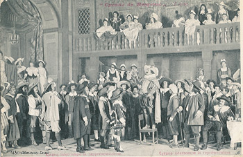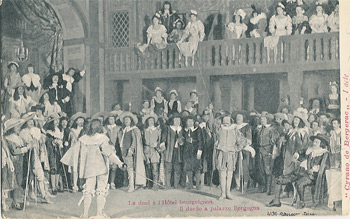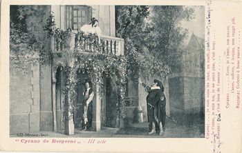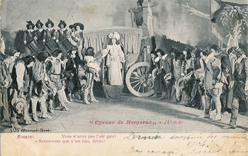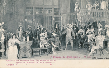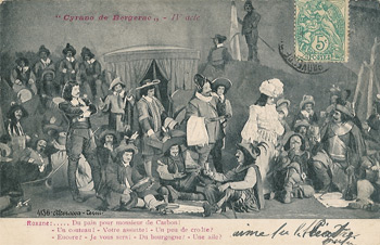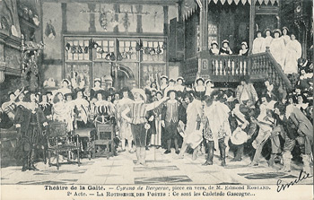 Cyrano fut, à la Gaîté, remonté à neuf. La salle de comédie de « l'Hôtel de Bourgogne » garde la même ordonnance et la « Rôtisserie des Poètes< ses mêmes appétissants motifs de comestibles. Pour le « Baiser de Roxane », M Ronsin et son talentueux adjoint, M. Bertin, ont innové un décor ravissant qui conserve la plantation obligée des logies voisins de Roxane et de Clomire, mais révèle dans les lointains une ruelle montueuse, où des pignons pressés cognent leurs toits renflés. Le camp de M. Lemeunier est fort judicieusement établi. Puis le jardin roux, du cinquième acte, aussi de MM Ronsin et Bertin, évoque la tristesse dont s'adoucit la mort héroïque de M. de Bergerac.