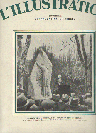 Le monument d'Edmond Rostand se dresse au parc Chanot, au centre d'une pelouse ombragée d'arbres dont les feuillages laissent couler la clarté et de l'ombre sur le bloc d'où sort, génie s'évadant de la matière, la tête pensive et rayonnante du poète (...)