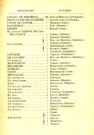 En franchissant les Pyrénées, l'arrogance et l'esprit chevaleresque de Cyrano rencontrèrent un immense succès, ce qui fit dire aux Espagnols que Cyrano était vraiment chez lui en Espagne. Maria Guerrero Torija, qui joue Roxane, est une grande comédienne espagnole (1867-1928), que l'on pourrait définir comme la Sarah Bernhardt espagnole). Elle fut la compagne puis l'épouse de Fernando DÃaz de Mendoza, un Grand d'Espagne ruiné amoureux de théâtre). Ils gérèrent pendant de très longue année une compagnie théâtrale qui fit des tournées dans tout le monde hispanique en particulier en Argentine où ils représentaient tous les ans des Å“uvres classiques. Maria Guerrero dirigea le "Théâtre de la Princesse" à Madrid qui porte aujourd'hui le nom de Maria Guerrero et est le siège de Centre National d'Art dramatique espagnol. Pour la petite histoire, ces deux grands acteurs sont les grands parents paternels de Fernando Fernán Gómez, le grand acteur et réalisateur espagnol. Cet artice a été réalisé grâce aux informations fournies par l'équipe de fans de l'acteur Alfredo Mayo qui croisera Cyrano dans le film d'Abel Gance "Cyrano et d'Artagnan" où il interprète le rôle d'un gentilhomme français.