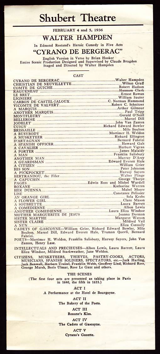 A 44 ans, Walter Hampden commence ce soir-là une complicité avec Cyrano qui va durer plusieurs années. Fidèle à ce rôle qui marquera sa carrière, il le sera moins avec ses Roxane ! La première s'appelle Carroll McComas ; en 1926, alors qu'il joue au New Colonial Theatre auquel, en son honneur, on vient de donner le nom d'Hampden's Theatre, la cousine de Cyrano s'appelle Marie Adels ; en 1928, c'est Ingeborg Torrup ; en 1932 au New Amsterdam Theatre, c'est Katherine Warren mais cette fois, il lui redonnera le rôle quatre ans plus tard, en 1936, au Shubert Theatre. C'est semble-t-il, la dernière apparition de Walter Hampden dans Cyrano. Il a alors 57 ans. Le texte utilisé est la traduction de Brian Hooker.
