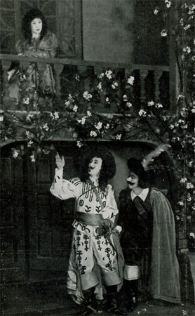 L'expérience que vient de tenter le théâtre Impérial avec le concours des grands acteurs Sadandji et Shôtchô a démontré que le rôle de Cyrano pouvait parfaitement plaire au tempérament japonais et que l'on aurait eu tort de ne pas faire confiance à l'habilité technique des metteurs en scène de Tokyo. L'action, soutenue par une troupe nombreuse et bien entraînée, s'est déroulée dans un cadre approprié et pittoresque dont les moindres détails avaient été soigneusement étudiés.