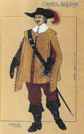 EL PERSONAJE. Edmond Rostand (1868-1918) ideó esta pieza a partir de un personaje real, Savinien Cyrano de Bergerac, un caballero francés nacido en el Perigord, en 1619, que tenÃa un carácter muy fuerte y una enorme nariz. Fue militar pero en 1642 se dedicó a estudiar Ciencia y Literatura en ParÃs. Escribió tragedias y comedias y dos libros de ciencia ficción. Fue un hombre orgulloso, librepensador y amigo de duelos. En él se inspira Cyrano de Bergerac, que fue estrenada por primera vez en 1897, en el teatro de la Porte-Saint-Martin de ParÃs.